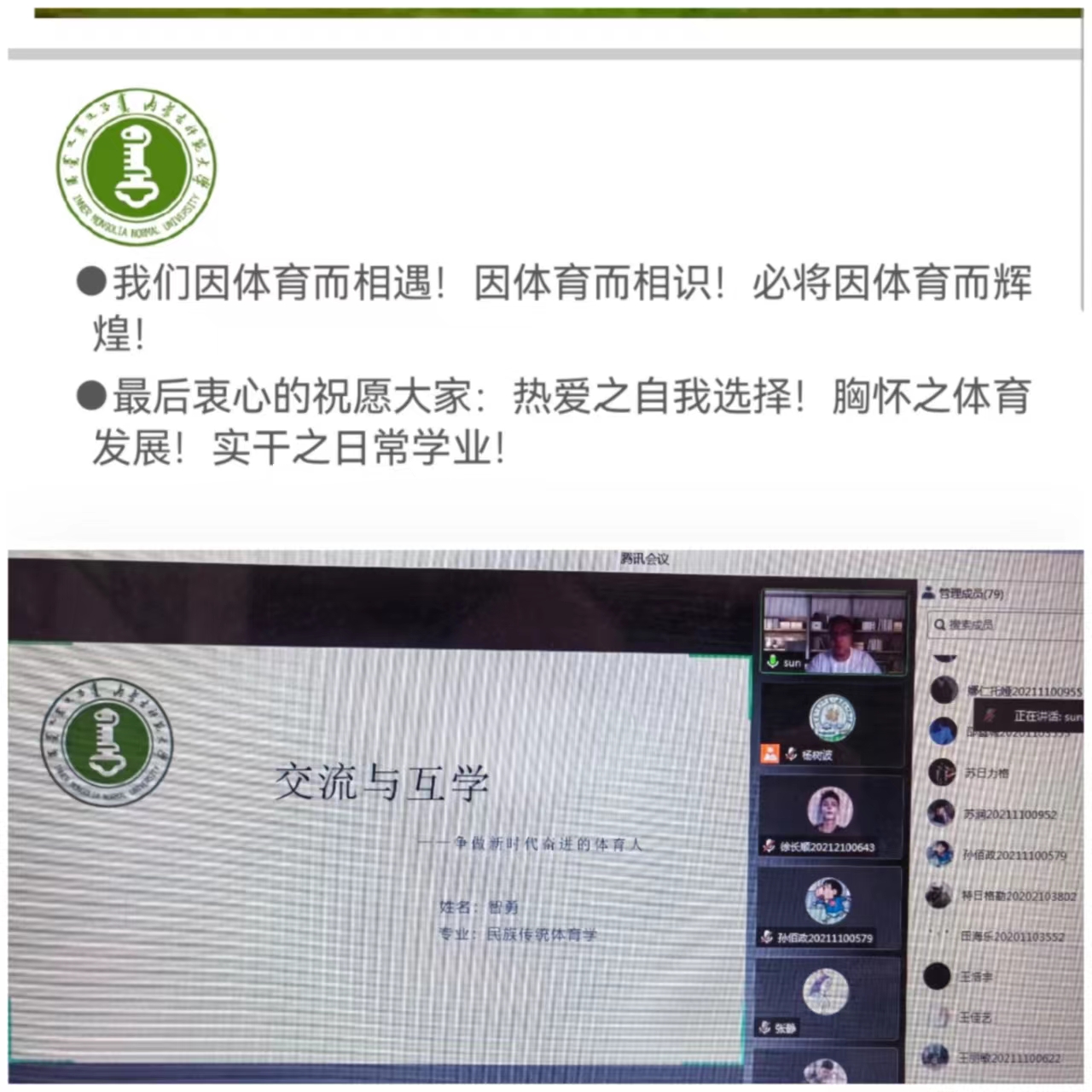 王佳艺同学围绕科研探索、知识学习、寓学于乐分享了科研、学习与生活等方面的心得;智勇同学从热爱、胸怀、实干三个方面并结合自身经历与大家分享了科研、学习、实践学习心得与成长感悟,鼓励师弟师妹们要热爱自己的选择、胸怀体育的发展、勤学实干实现梦想。