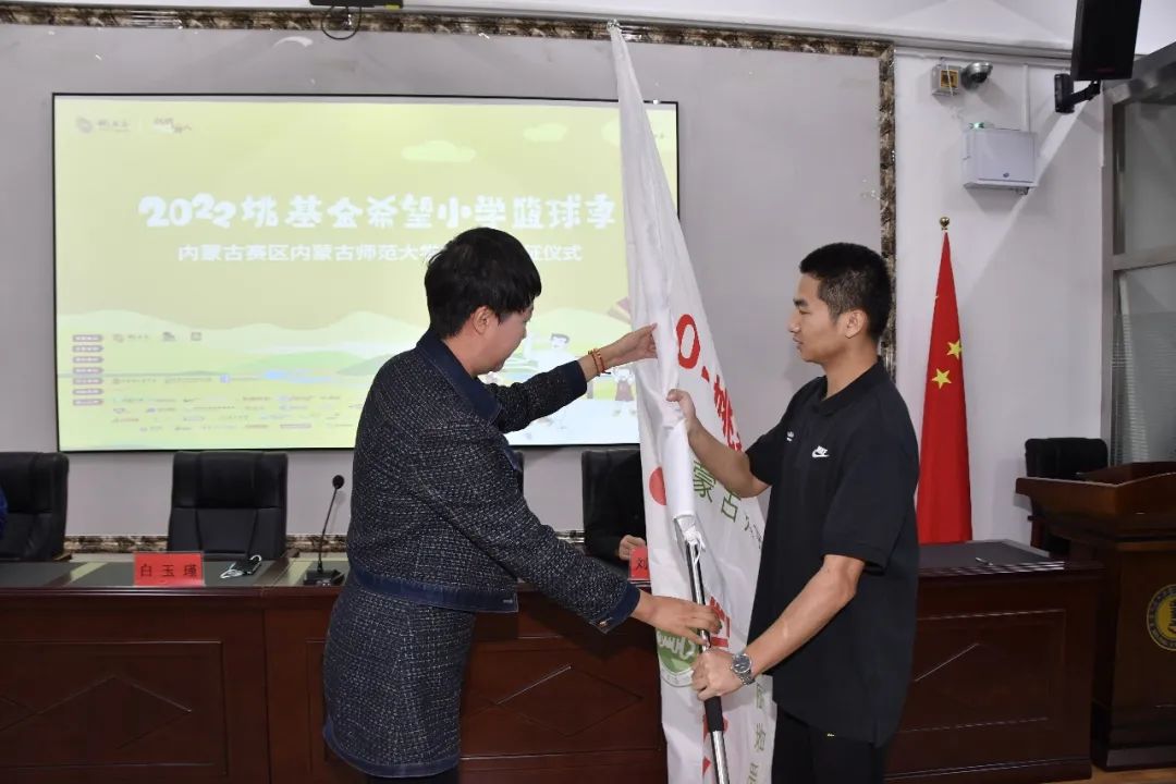 内蒙古青基会项目管理部副部长白玉瑾向支教志愿者代表授旗