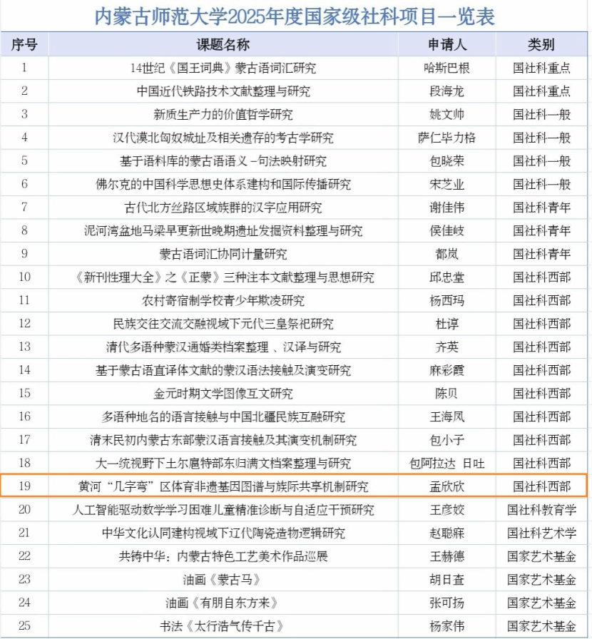 近日,2025年度国家哲学社会科学规划基金项目立项结果揭晓,yl6776永利集团孟欣欣老师主持的《黄河“几字弯”区体育非遗基因图谱与族际共享机制研究》获批西部项目。本次立项是学院近年来高度重视有组织科研的有力见证。yl6776永利集团积极鼓励教师申报各级各类科研项目,通过制定详细的科研规划,为教师提供明确的科研方向;搭建科研交流平台,促进教师之间的合作与资源共享;组织专家进行项目申报指导,提升教师申报书撰写质量,极大地激发了教师的科研积极性。