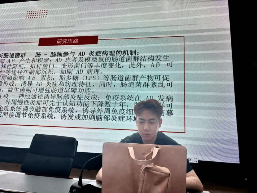 2024级运动人体科学专业学生代表冀子琦分享论文《运动通过调节肠道菌群-肠-脑轴免疫途径改善阿尔茨海默症炎症病理的研究进展》。介绍了阿尔茨海默症的研究新视角,未来可通过“运动+微生态调节”的组合策略,进一步提升防治效果。